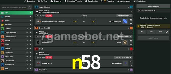 O n58 oferece uma grande seleção de opções de apostas em e-sports com probabilidades competitivas